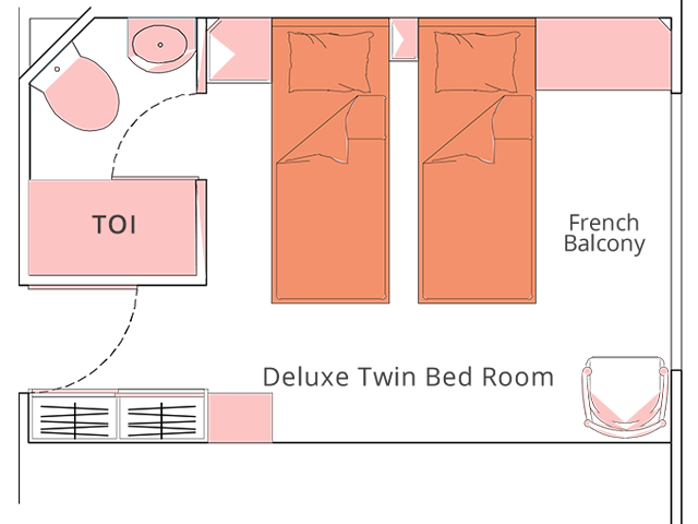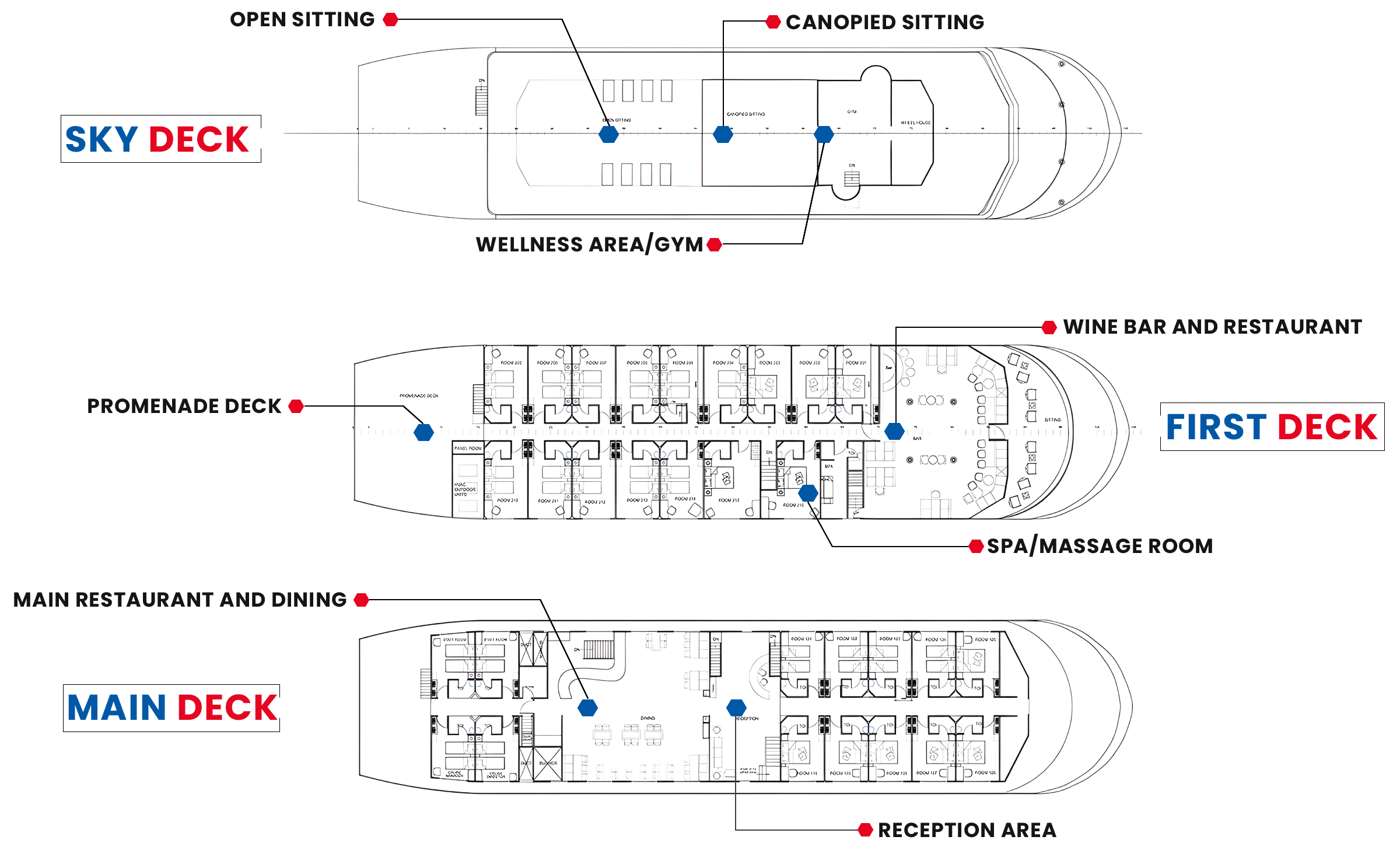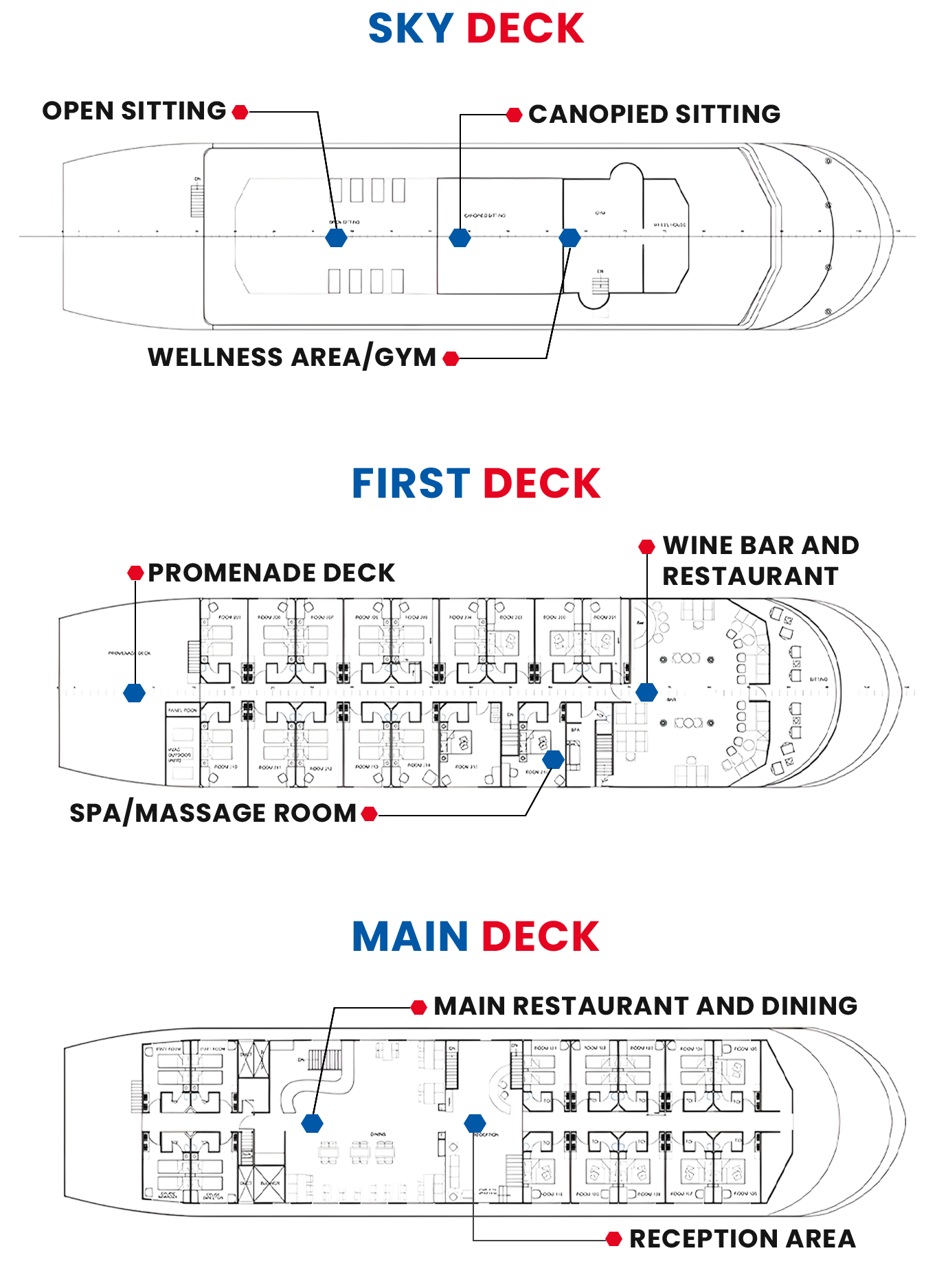 First Deck: Has 16 State Rooms with attached bath and French balcony, The Bar and Restaurant, the massage parlour with Steam and sauna facility and has a Promenade Deck which is converted into activity area like Gym etc.